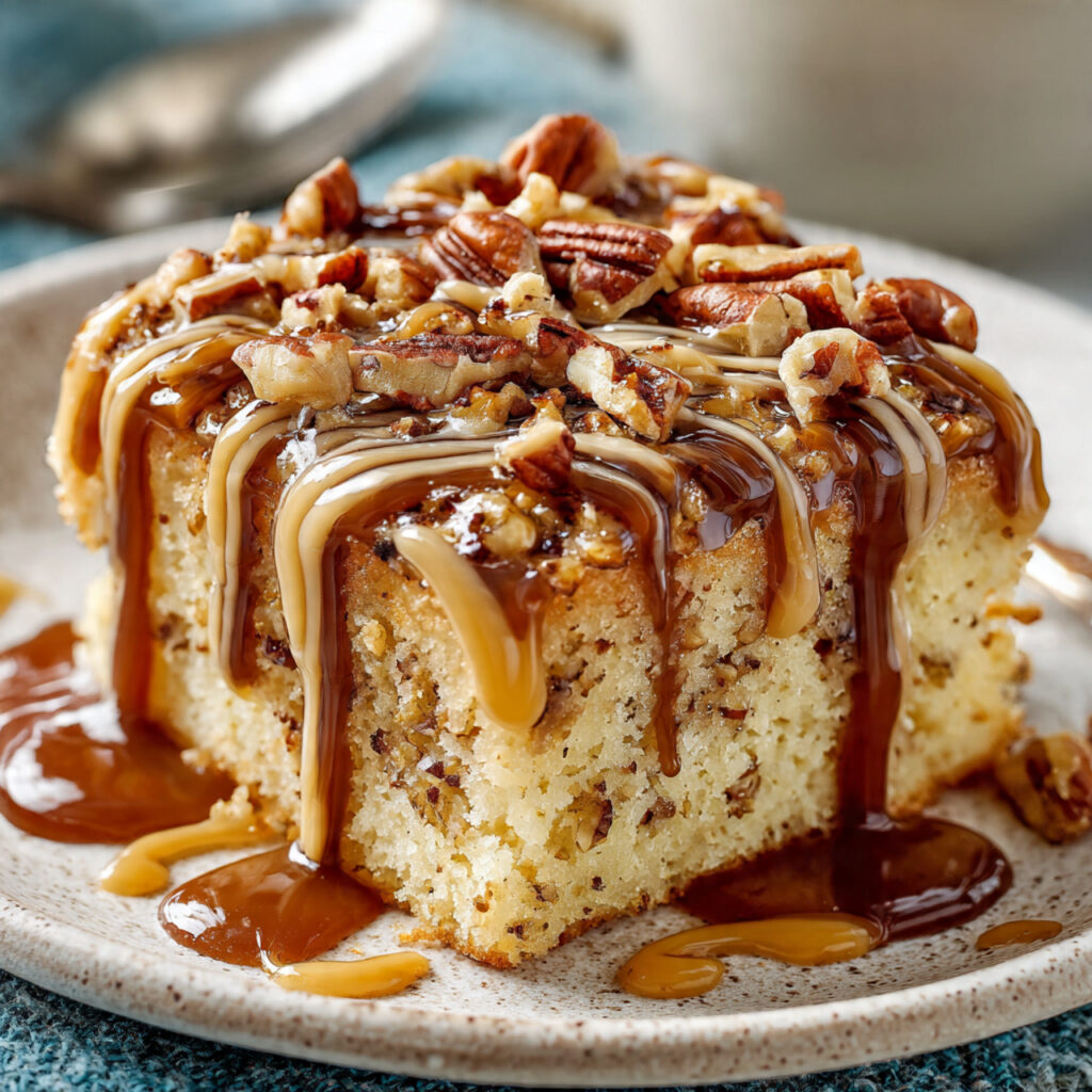 - For topping: Melt butter, stir in brown sugar, cream, vanilla, and salt. Simmer 2–3 minutes, then add toasted pecans. Cool slightly and spread over cake.